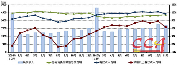 國家統計局日前發布消費市場最新數據,11月份,全國餐飲收入3034億元,同比增長11.5%,高于上年同期1.7個百分點;限額以上單位餐飲收入804億元,同比增長6.5%,比上年同期上漲4.1個百分點。單月來看,11月餐飲市場發展增速大幅回落,餐飲收入增速環比下跌0.9個百分點,限上餐飲收入更是環比下跌達2.3個百分點,全國餐飲市場與社會消費品零售總額增幅(11.2%)的差距也縮至0.3個百分點,優勢不再明顯。
